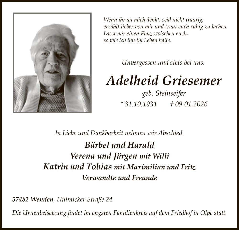 Hier finden Sie alle Traueranzeigen aus der Zeitung, die bisher für Adelheid Griesemer erschienen sind. Weitere Traueranzeigen, die in der Zeitung erscheinen, werden hier ebenfalls aufgelistet