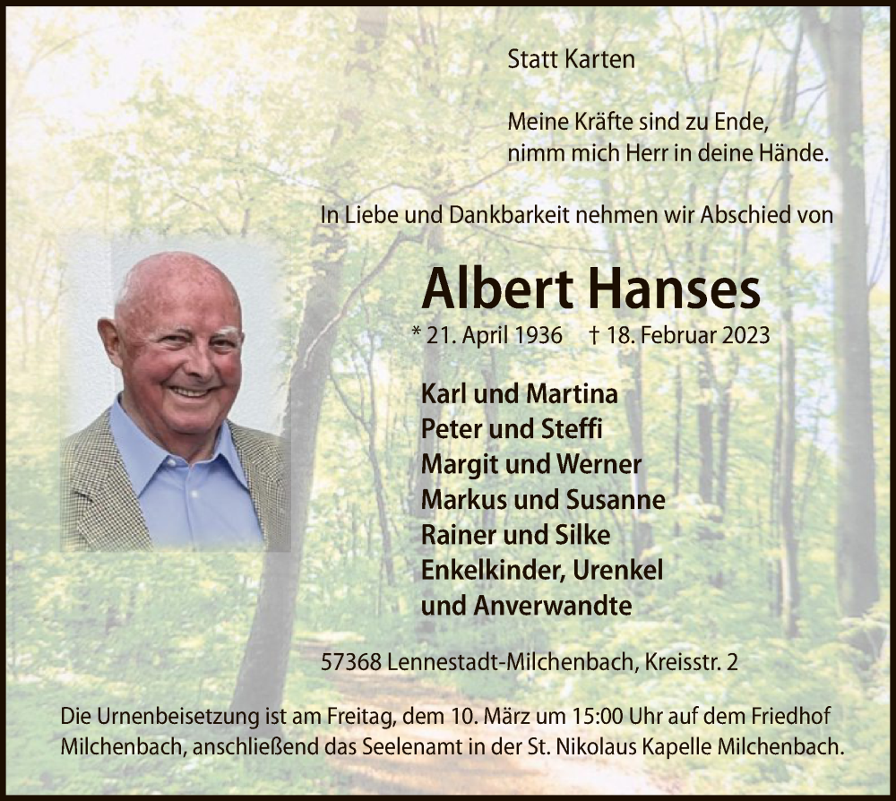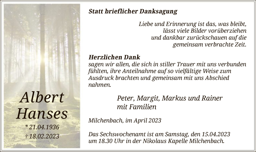 Hier finden Sie alle Traueranzeigen aus der Zeitung, die bisher für Albert Hanses erschienen sind. Weitere Traueranzeigen, die in der Zeitung erscheinen, werden hier ebenfalls aufgelistet