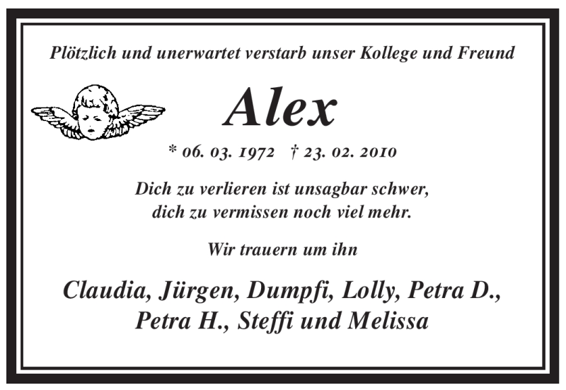 Hier finden Sie alle Traueranzeigen aus der Zeitung, die bisher für Alex Unbekannt erschienen sind. Weitere Traueranzeigen, die in der Zeitung erscheinen, werden hier ebenfalls aufgelistet
