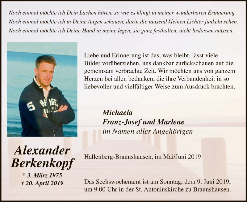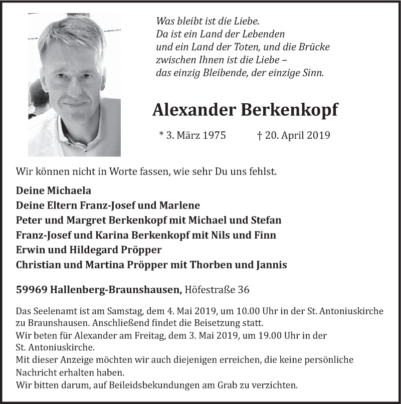 Hier finden Sie alle Traueranzeigen aus der Zeitung, die bisher für Alexander Berkenkopf erschienen sind. Weitere Traueranzeigen, die in der Zeitung erscheinen, werden hier ebenfalls aufgelistet