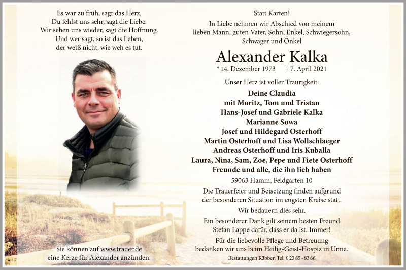 Hier finden Sie alle Traueranzeigen aus der Zeitung, die bisher für Alexander Kalka erschienen sind. Weitere Traueranzeigen, die in der Zeitung erscheinen, werden hier ebenfalls aufgelistet
