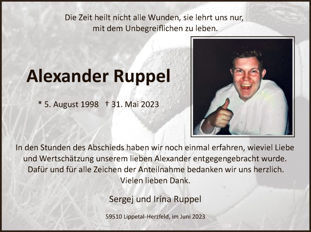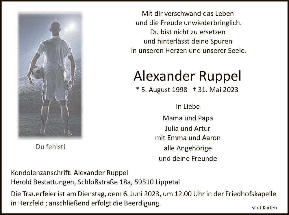 Hier finden Sie alle Traueranzeigen aus der Zeitung, die bisher für Alexander Ruppel erschienen sind. Weitere Traueranzeigen, die in der Zeitung erscheinen, werden hier ebenfalls aufgelistet
