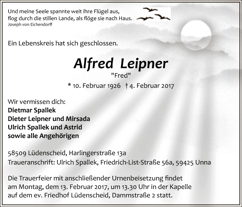 Hier finden Sie alle Traueranzeigen aus der Zeitung, die bisher für Alfred Leipner erschienen sind. Weitere Traueranzeigen, die in der Zeitung erscheinen, werden hier ebenfalls aufgelistet