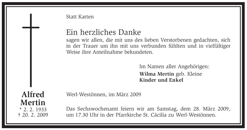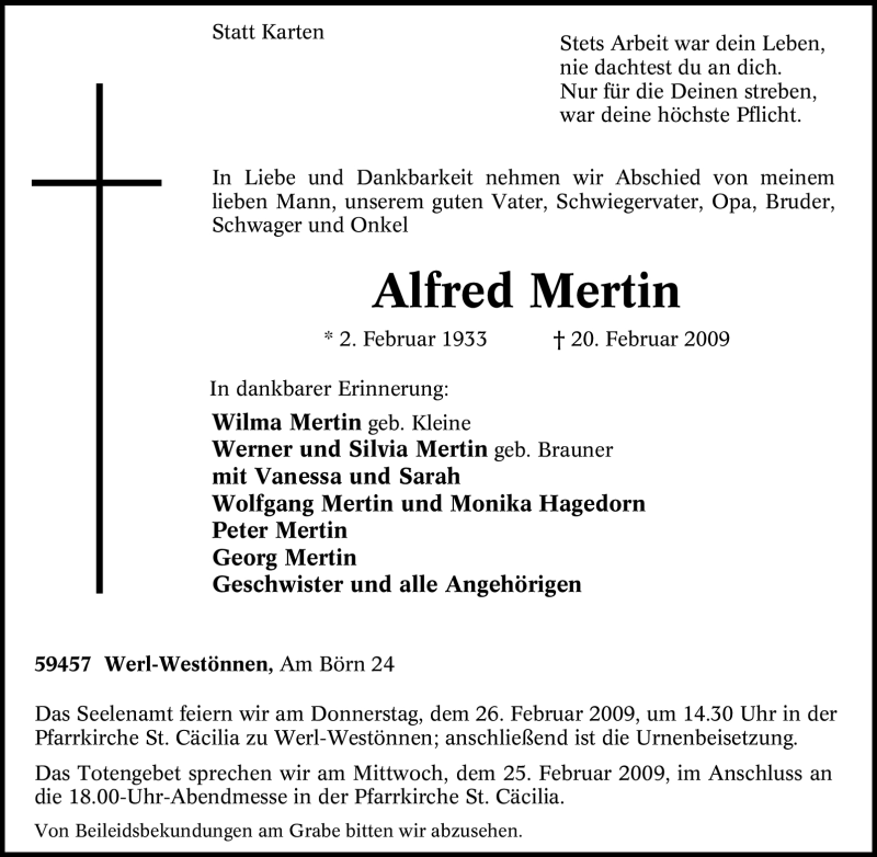 Hier finden Sie alle Traueranzeigen aus der Zeitung, die bisher für Alfred Mertin erschienen sind. Weitere Traueranzeigen, die in der Zeitung erscheinen, werden hier ebenfalls aufgelistet
