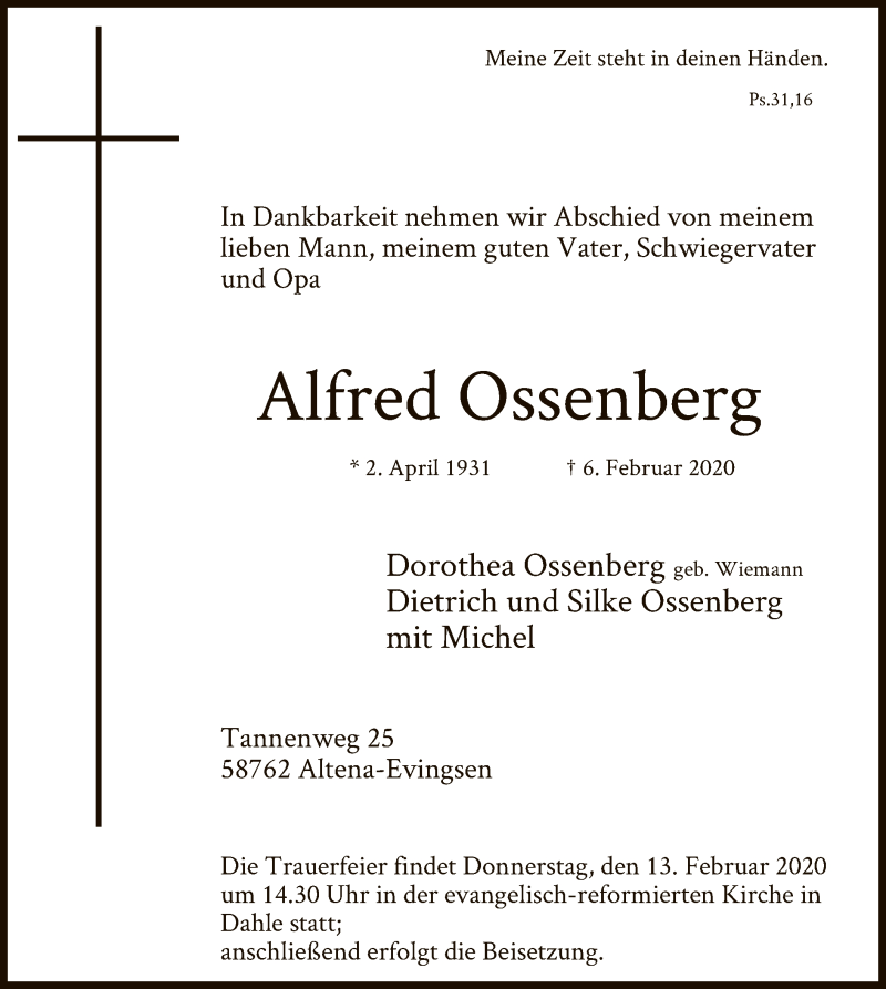Hier finden Sie alle Traueranzeigen aus der Zeitung, die bisher für Alfred Ossenberg erschienen sind. Weitere Traueranzeigen, die in der Zeitung erscheinen, werden hier ebenfalls aufgelistet
