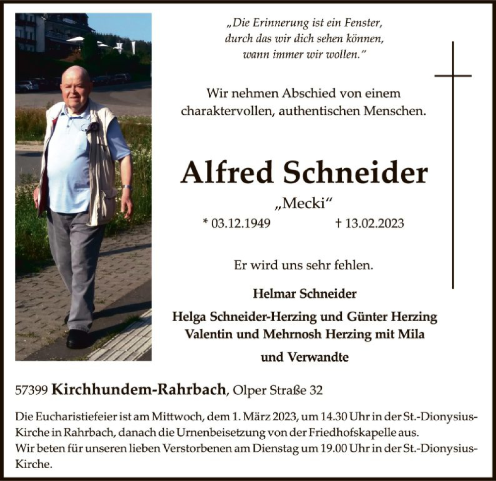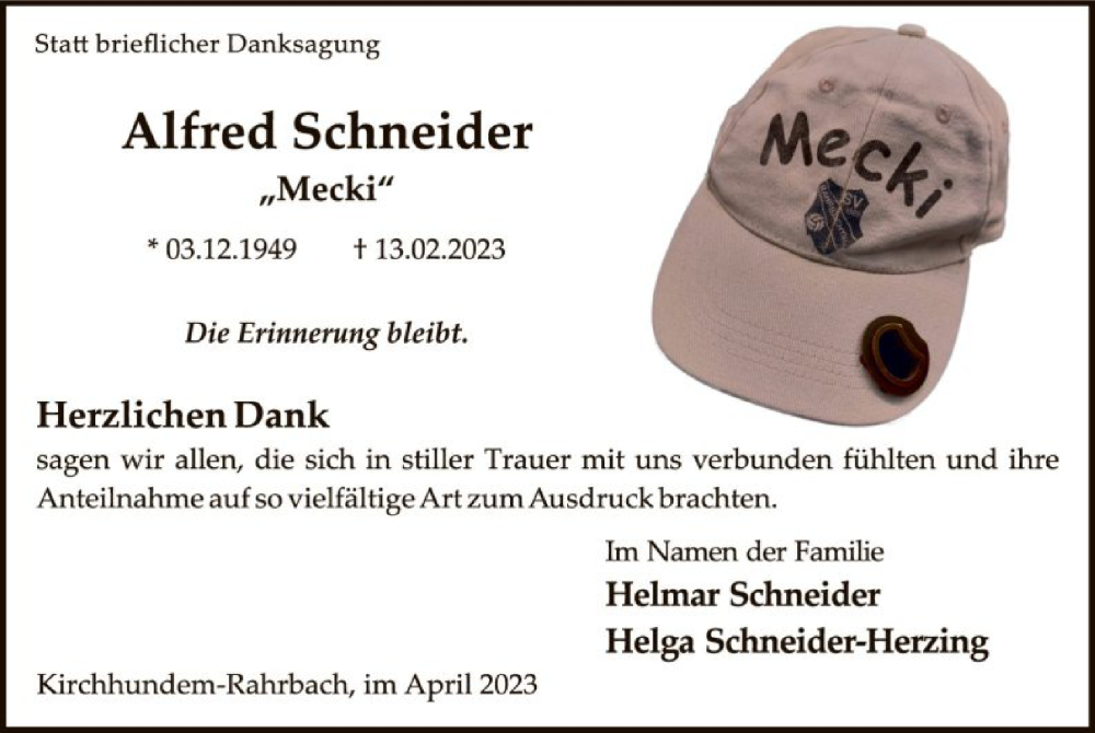 Hier finden Sie alle Traueranzeigen aus der Zeitung, die bisher für Alfred Schneider erschienen sind. Weitere Traueranzeigen, die in der Zeitung erscheinen, werden hier ebenfalls aufgelistet