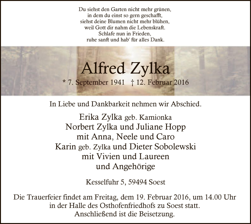 Hier finden Sie alle Traueranzeigen aus der Zeitung, die bisher für Alfred Zylka erschienen sind. Weitere Traueranzeigen, die in der Zeitung erscheinen, werden hier ebenfalls aufgelistet