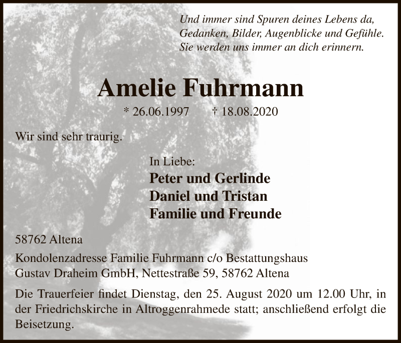 Hier finden Sie alle Traueranzeigen aus der Zeitung, die bisher für Amelie Fuhrmann erschienen sind. Weitere Traueranzeigen, die in der Zeitung erscheinen, werden hier ebenfalls aufgelistet