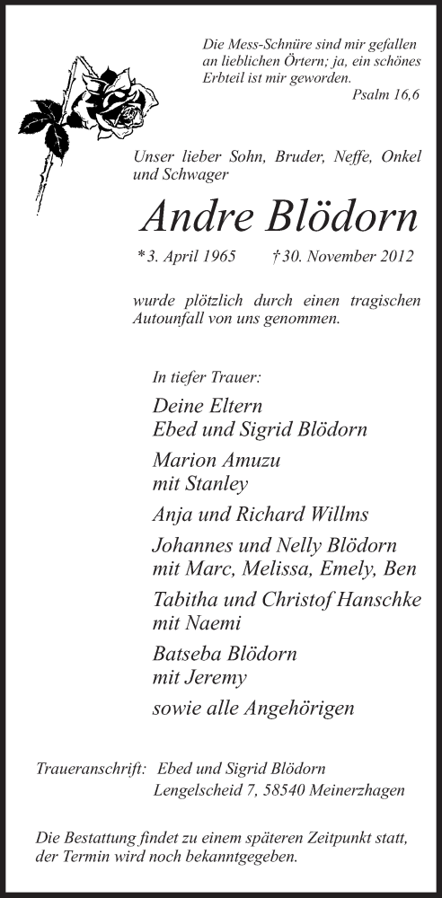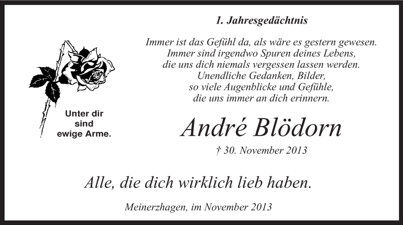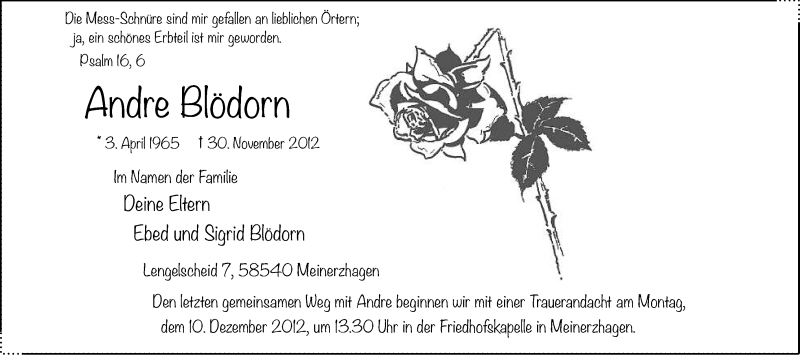 Hier finden Sie alle Traueranzeigen aus der Zeitung, die bisher für Andre Blödorn erschienen sind. Weitere Traueranzeigen, die in der Zeitung erscheinen, werden hier ebenfalls aufgelistet