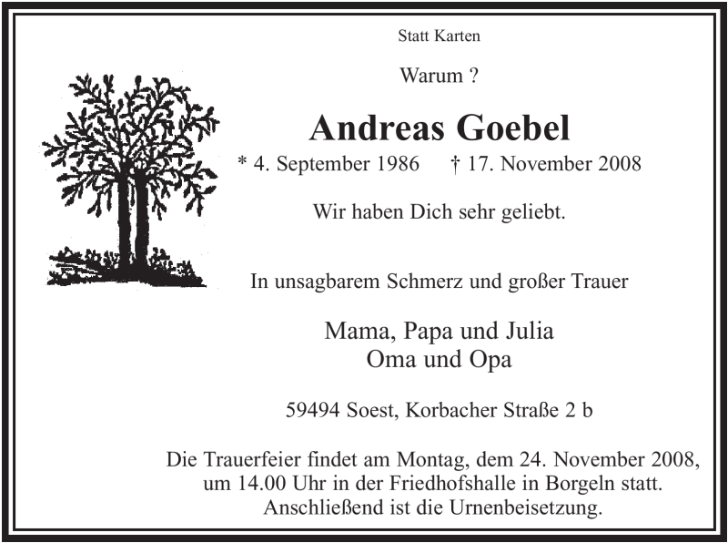 Hier finden Sie alle Traueranzeigen aus der Zeitung, die bisher für Andreas Goebel erschienen sind. Weitere Traueranzeigen, die in der Zeitung erscheinen, werden hier ebenfalls aufgelistet