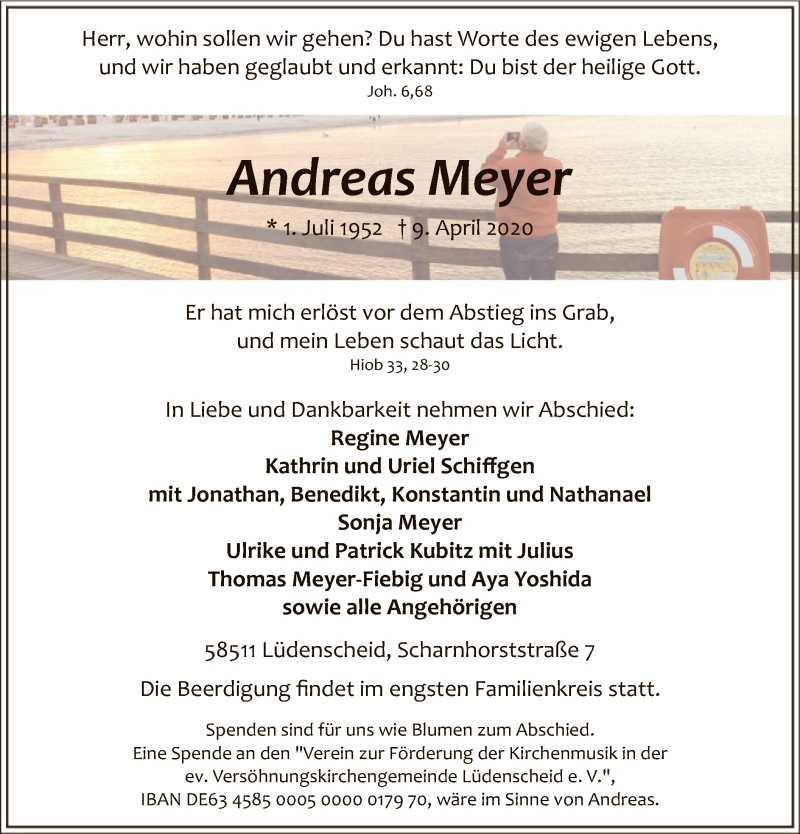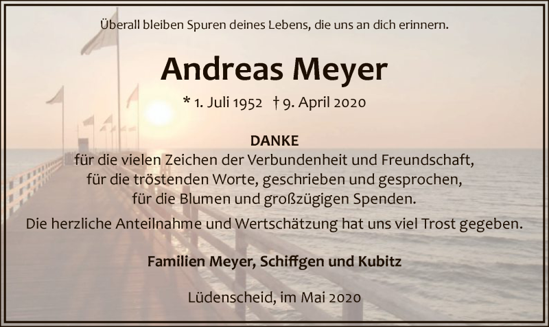 Hier finden Sie alle Traueranzeigen aus der Zeitung, die bisher für Andreas Meyer erschienen sind. Weitere Traueranzeigen, die in der Zeitung erscheinen, werden hier ebenfalls aufgelistet