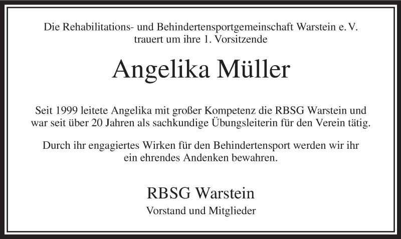 Hier finden Sie alle Traueranzeigen aus der Zeitung, die bisher für Angelika Müller erschienen sind. Weitere Traueranzeigen, die in der Zeitung erscheinen, werden hier ebenfalls aufgelistet