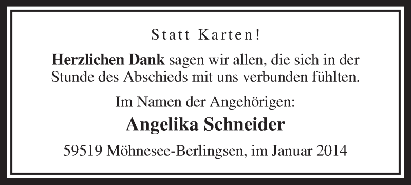Hier finden Sie alle Traueranzeigen aus der Zeitung, die bisher für Angelika Schneider erschienen sind. Weitere Traueranzeigen, die in der Zeitung erscheinen, werden hier ebenfalls aufgelistet