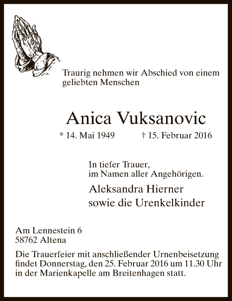 Hier finden Sie alle Traueranzeigen aus der Zeitung, die bisher für Anica Vuksanovic erschienen sind. Weitere Traueranzeigen, die in der Zeitung erscheinen, werden hier ebenfalls aufgelistet