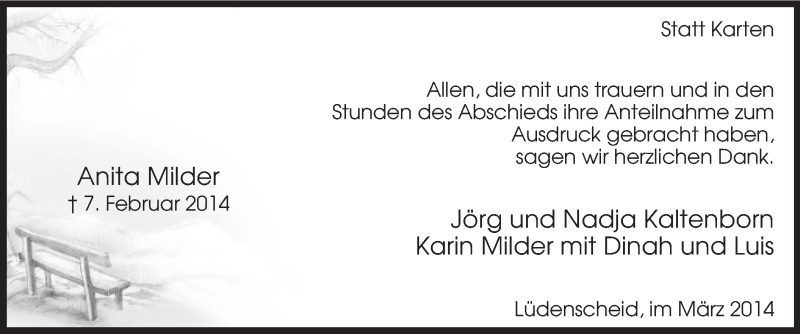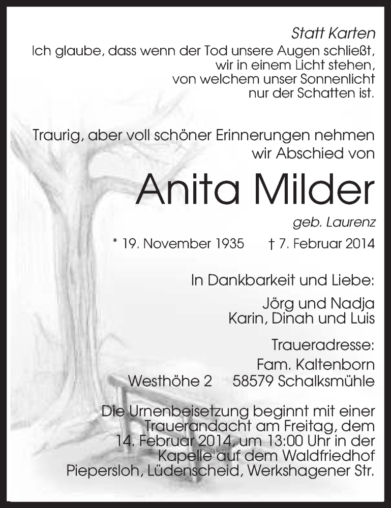 Hier finden Sie alle Traueranzeigen aus der Zeitung, die bisher für Anita Milder erschienen sind. Weitere Traueranzeigen, die in der Zeitung erscheinen, werden hier ebenfalls aufgelistet