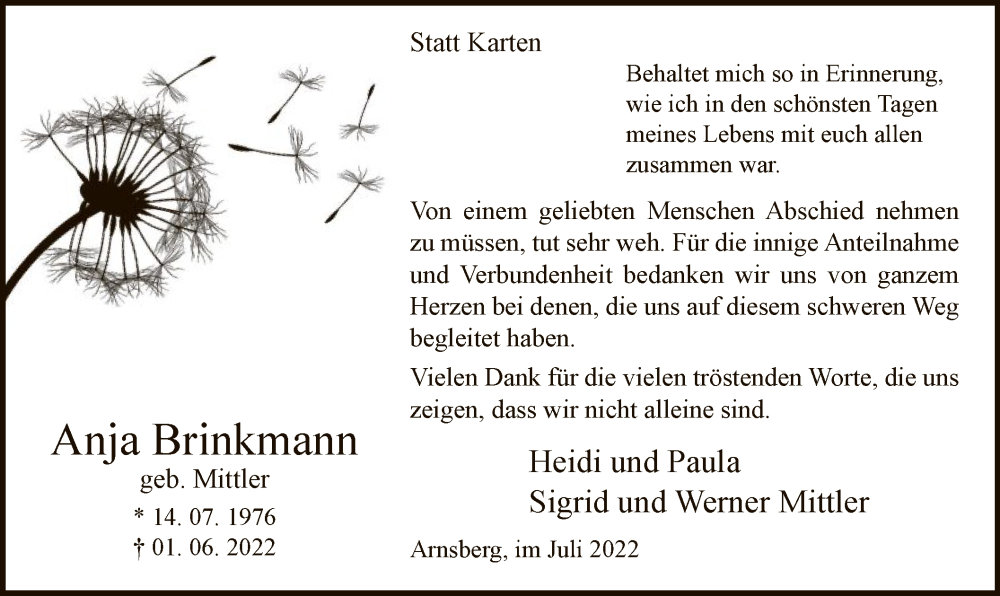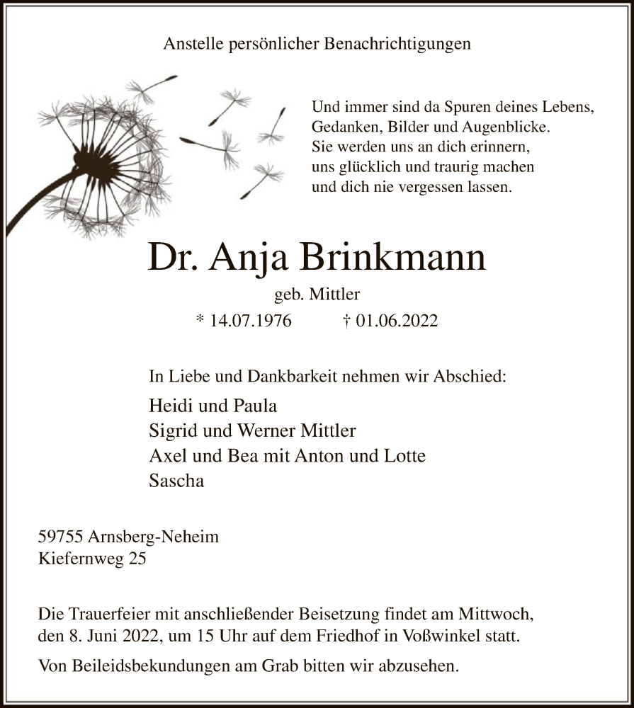 Hier finden Sie alle Traueranzeigen aus der Zeitung, die bisher für Anja Brinkmann erschienen sind. Weitere Traueranzeigen, die in der Zeitung erscheinen, werden hier ebenfalls aufgelistet