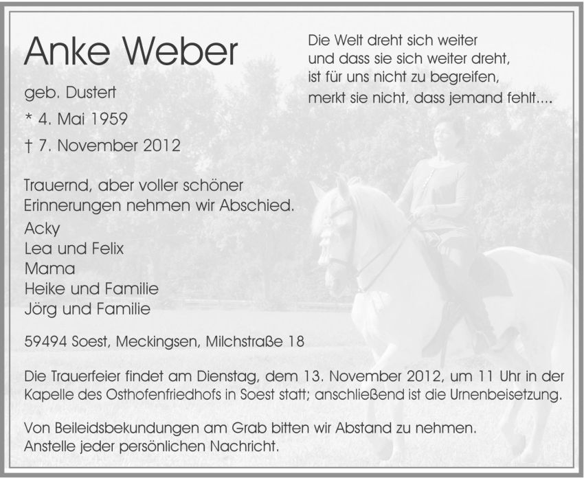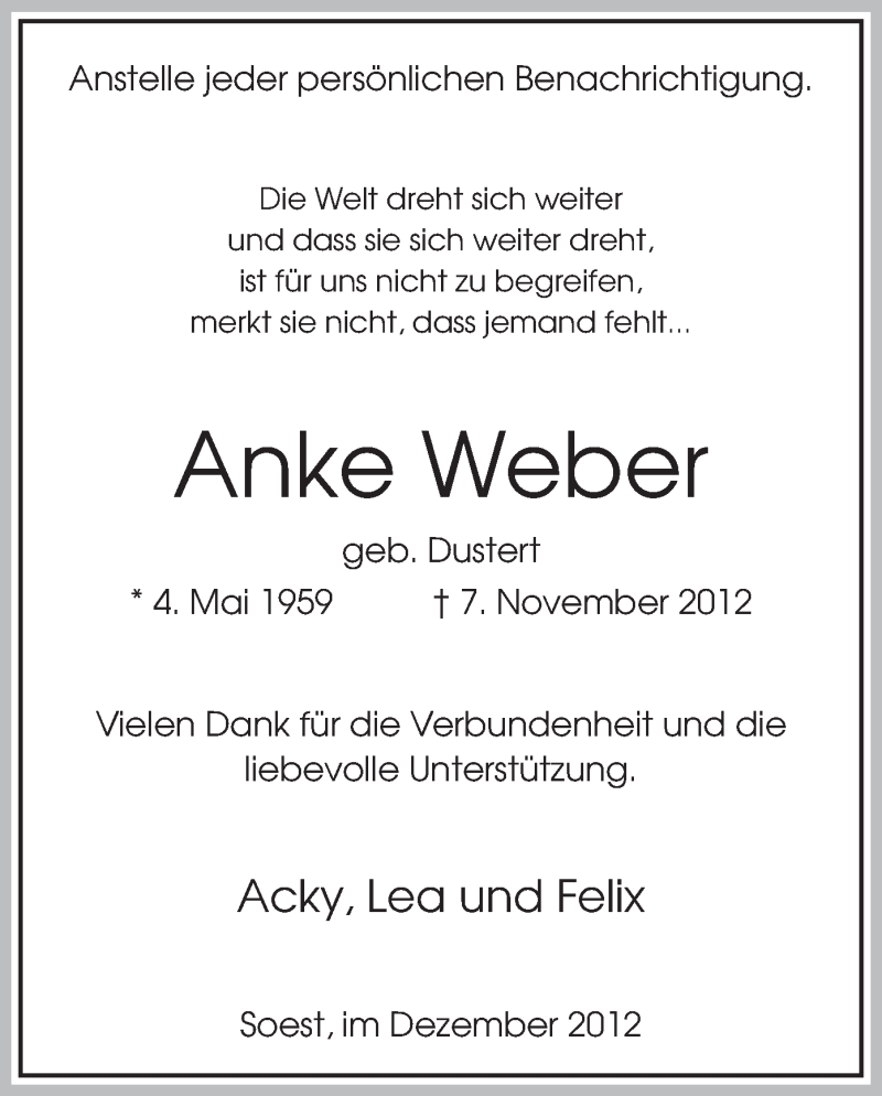 Hier finden Sie alle Traueranzeigen aus der Zeitung, die bisher für Anke Weber erschienen sind. Weitere Traueranzeigen, die in der Zeitung erscheinen, werden hier ebenfalls aufgelistet