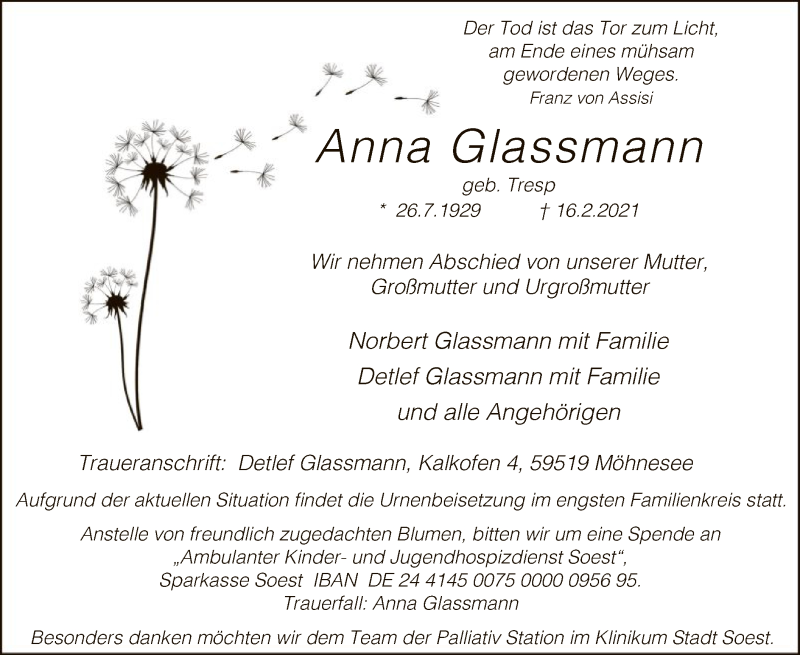 Hier finden Sie alle Traueranzeigen aus der Zeitung, die bisher für Anna Glassmann erschienen sind. Weitere Traueranzeigen, die in der Zeitung erscheinen, werden hier ebenfalls aufgelistet