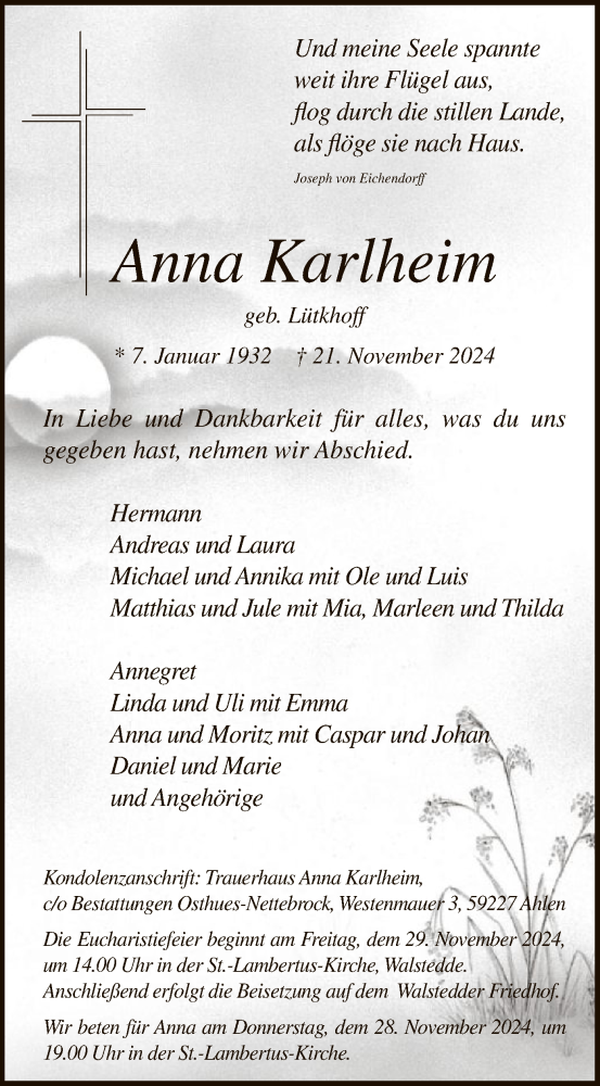 Hier finden Sie alle Traueranzeigen aus der Zeitung, die bisher für Anna Karlheim erschienen sind. Weitere Traueranzeigen, die in der Zeitung erscheinen, werden hier ebenfalls aufgelistet