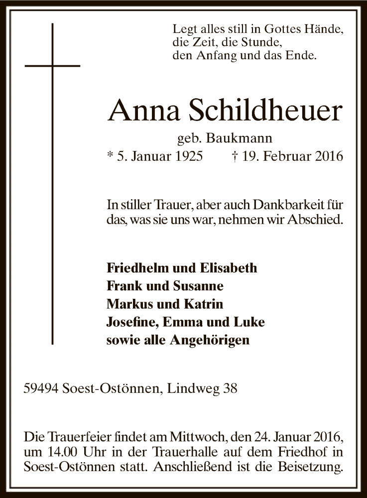 Hier finden Sie alle Traueranzeigen aus der Zeitung, die bisher für Anna Schildheuer erschienen sind. Weitere Traueranzeigen, die in der Zeitung erscheinen, werden hier ebenfalls aufgelistet