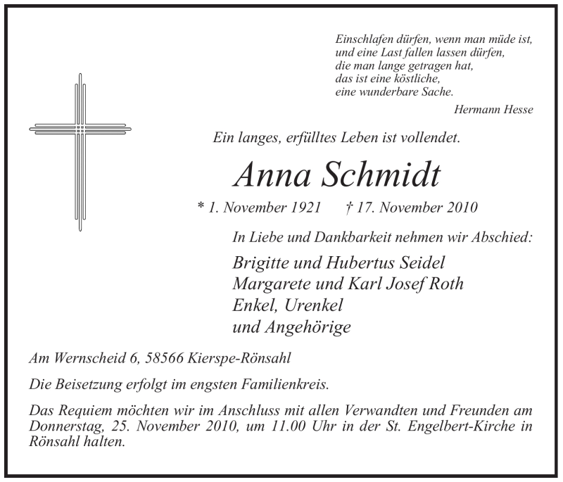Hier finden Sie alle Traueranzeigen aus der Zeitung, die bisher für Anna Schmidt erschienen sind. Weitere Traueranzeigen, die in der Zeitung erscheinen, werden hier ebenfalls aufgelistet