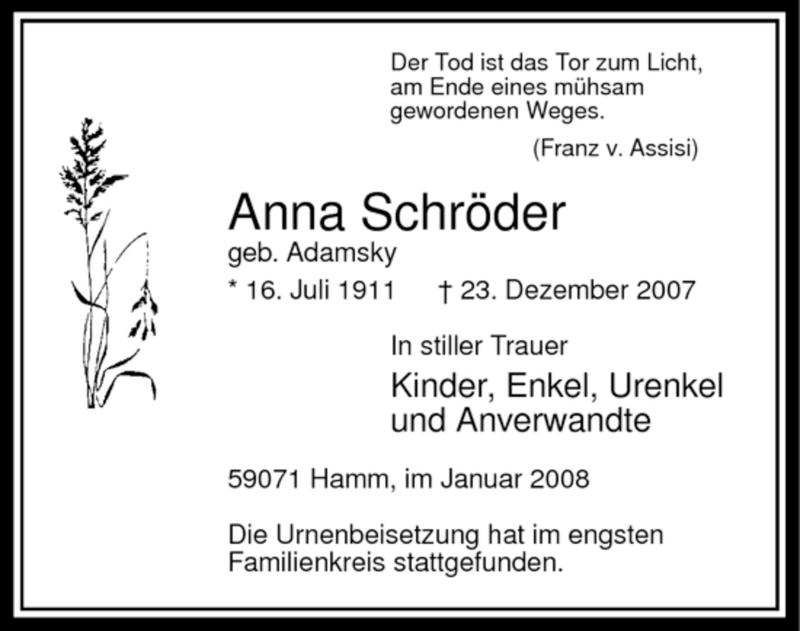 Hier finden Sie alle Traueranzeigen aus der Zeitung, die bisher für Anna Schröder erschienen sind. Weitere Traueranzeigen, die in der Zeitung erscheinen, werden hier ebenfalls aufgelistet