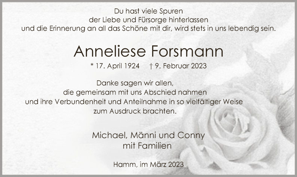 Hier finden Sie alle Traueranzeigen aus der Zeitung, die bisher für Anneliese Forsmann erschienen sind. Weitere Traueranzeigen, die in der Zeitung erscheinen, werden hier ebenfalls aufgelistet