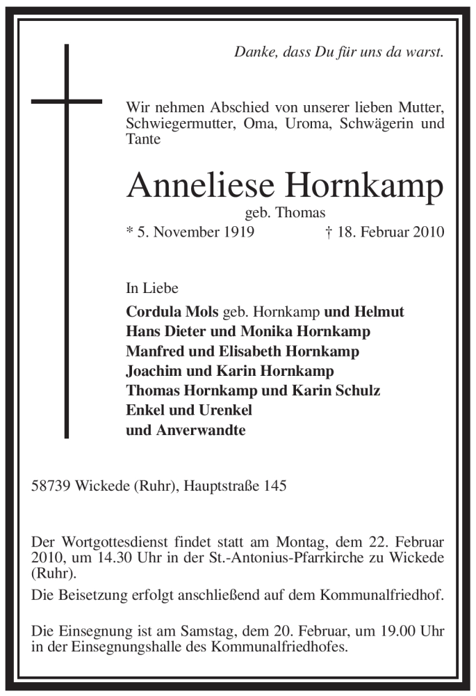 Hier finden Sie alle Traueranzeigen aus der Zeitung, die bisher für Anneliese Hornkamp erschienen sind. Weitere Traueranzeigen, die in der Zeitung erscheinen, werden hier ebenfalls aufgelistet