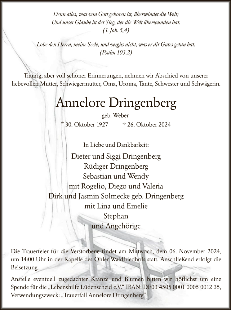 Hier finden Sie alle Traueranzeigen aus der Zeitung, die bisher für Annelore Dringenberg erschienen sind. Weitere Traueranzeigen, die in der Zeitung erscheinen, werden hier ebenfalls aufgelistet