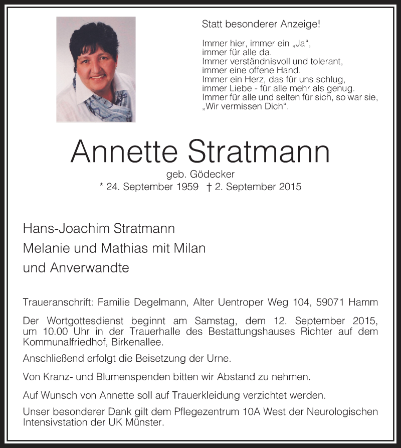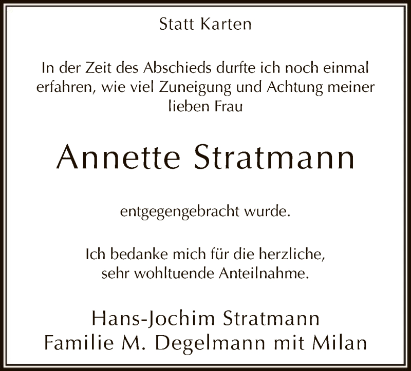 Hier finden Sie alle Traueranzeigen aus der Zeitung, die bisher für Annette Stratmann erschienen sind. Weitere Traueranzeigen, die in der Zeitung erscheinen, werden hier ebenfalls aufgelistet