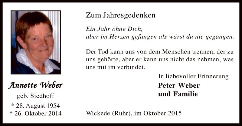 Hier finden Sie alle Traueranzeigen aus der Zeitung, die bisher für Annette Weber erschienen sind. Weitere Traueranzeigen, die in der Zeitung erscheinen, werden hier ebenfalls aufgelistet