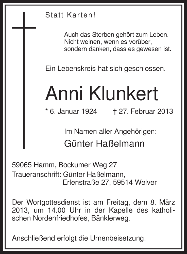 Hier finden Sie alle Traueranzeigen aus der Zeitung, die bisher für Anni Klunkert erschienen sind. Weitere Traueranzeigen, die in der Zeitung erscheinen, werden hier ebenfalls aufgelistet