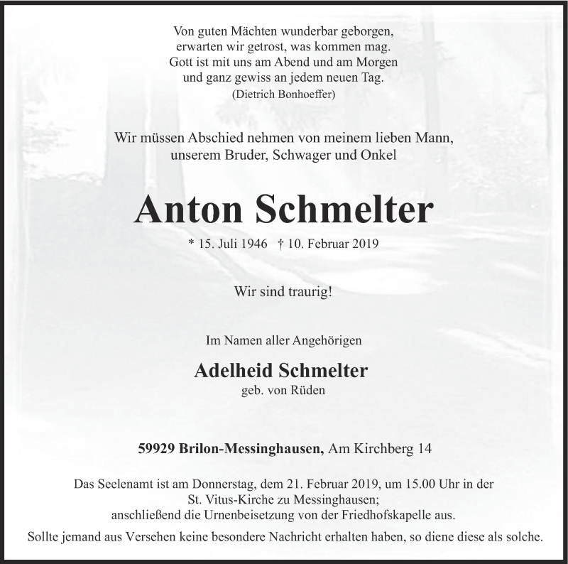 Hier finden Sie alle Traueranzeigen aus der Zeitung, die bisher für Anton Schmelter erschienen sind. Weitere Traueranzeigen, die in der Zeitung erscheinen, werden hier ebenfalls aufgelistet