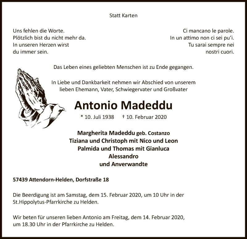 Hier finden Sie alle Traueranzeigen aus der Zeitung, die bisher für Antonio Madeddu erschienen sind. Weitere Traueranzeigen, die in der Zeitung erscheinen, werden hier ebenfalls aufgelistet