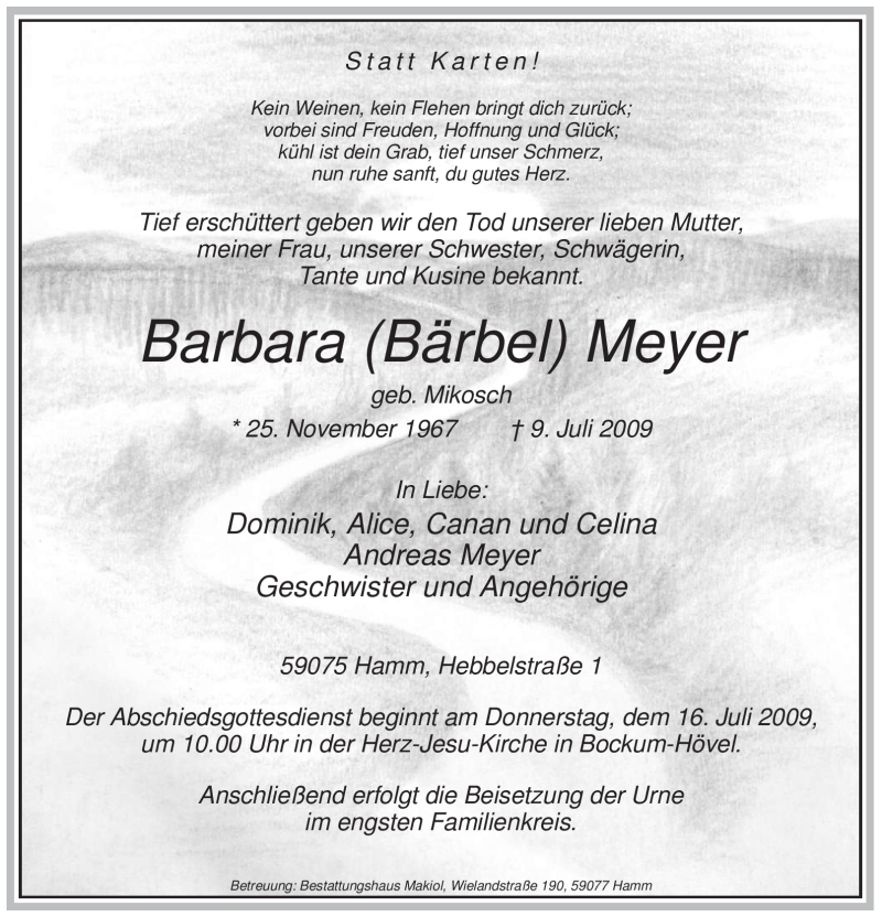 Hier finden Sie alle Traueranzeigen aus der Zeitung, die bisher für Barbara Meyer erschienen sind. Weitere Traueranzeigen, die in der Zeitung erscheinen, werden hier ebenfalls aufgelistet