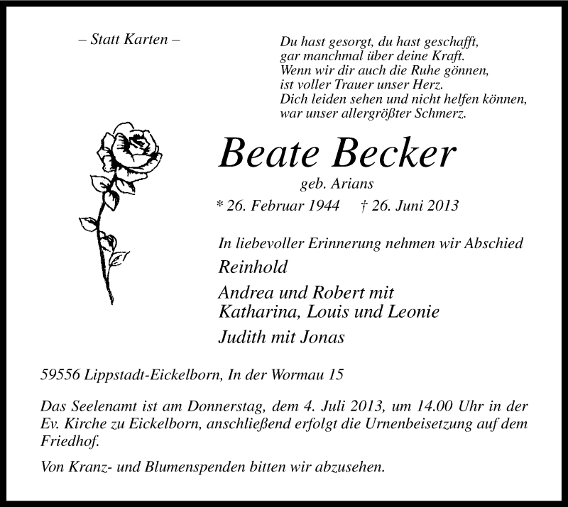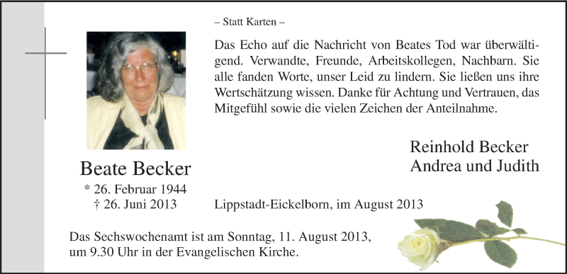 Hier finden Sie alle Traueranzeigen aus der Zeitung, die bisher für Beate Becker erschienen sind. Weitere Traueranzeigen, die in der Zeitung erscheinen, werden hier ebenfalls aufgelistet