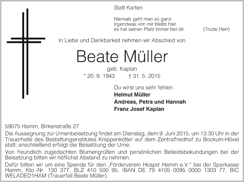Hier finden Sie alle Traueranzeigen aus der Zeitung, die bisher für Beate Müller erschienen sind. Weitere Traueranzeigen, die in der Zeitung erscheinen, werden hier ebenfalls aufgelistet