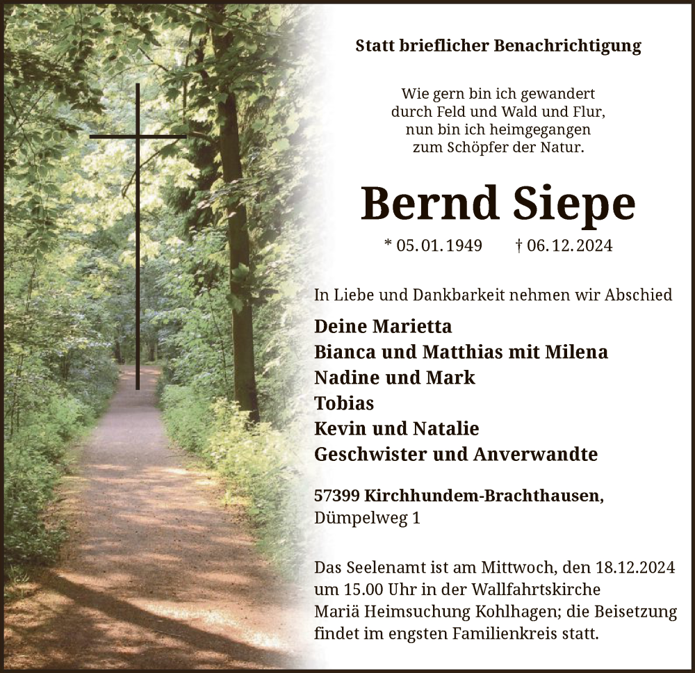 Hier finden Sie alle Traueranzeigen aus der Zeitung, die bisher für Bernd Siepe erschienen sind. Weitere Traueranzeigen, die in der Zeitung erscheinen, werden hier ebenfalls aufgelistet
