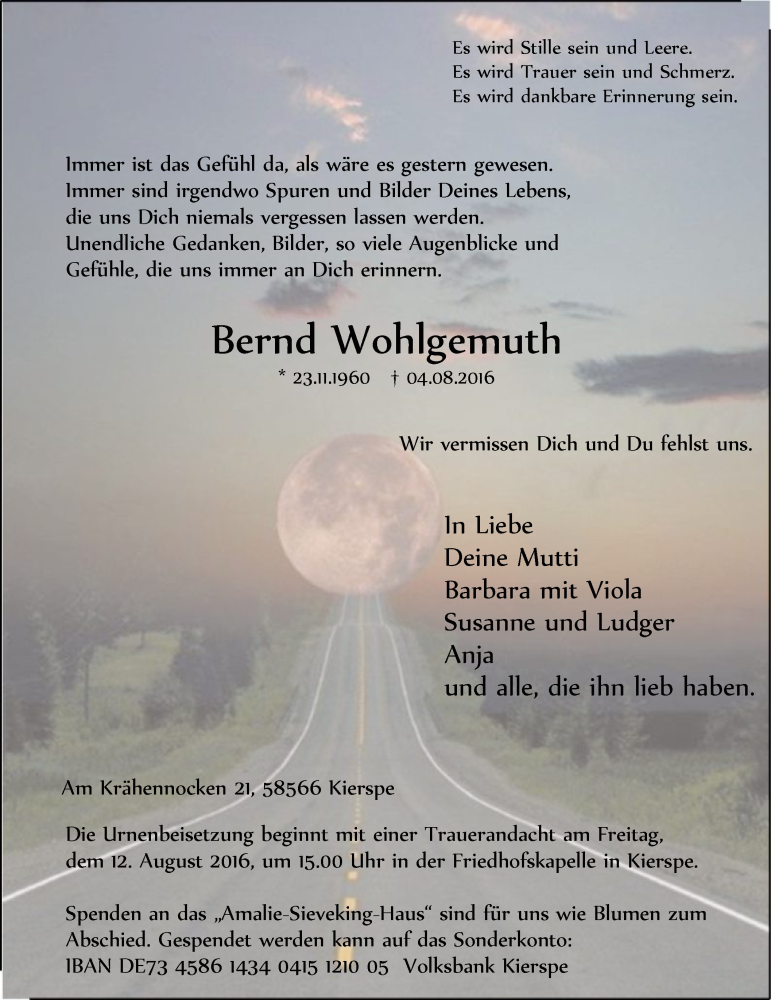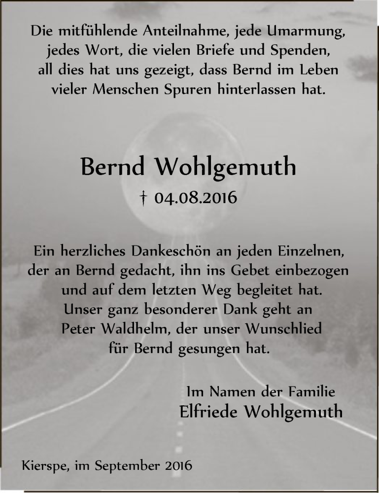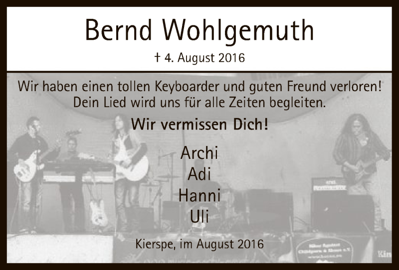 Hier finden Sie alle Traueranzeigen aus der Zeitung, die bisher für Bernd Wohlgemuth erschienen sind. Weitere Traueranzeigen, die in der Zeitung erscheinen, werden hier ebenfalls aufgelistet