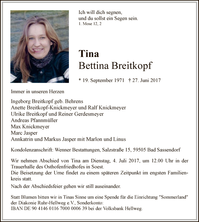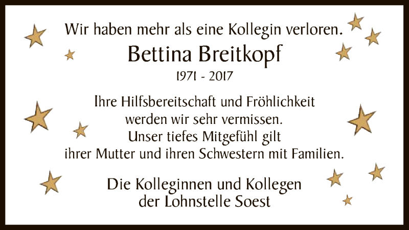 Hier finden Sie alle Traueranzeigen aus der Zeitung, die bisher für Bettina Breitkopf erschienen sind. Weitere Traueranzeigen, die in der Zeitung erscheinen, werden hier ebenfalls aufgelistet