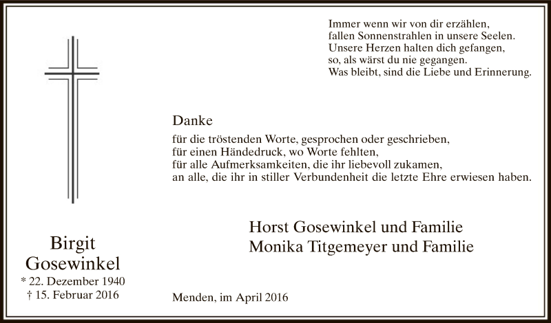 Hier finden Sie alle Traueranzeigen aus der Zeitung, die bisher für Birgit Gosewinkel erschienen sind. Weitere Traueranzeigen, die in der Zeitung erscheinen, werden hier ebenfalls aufgelistet