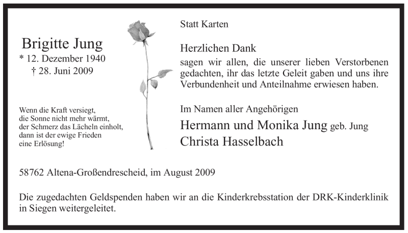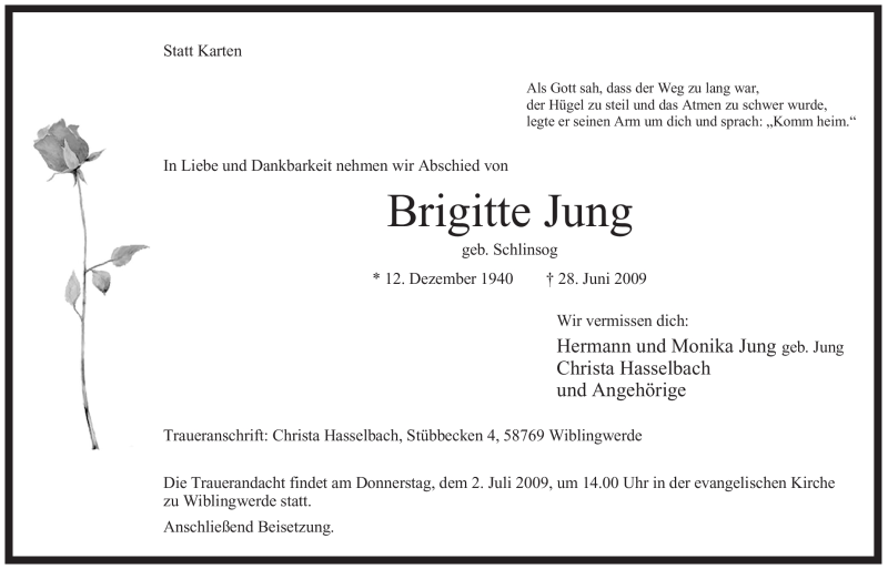 Hier finden Sie alle Traueranzeigen aus der Zeitung, die bisher für Brigitte Jung erschienen sind. Weitere Traueranzeigen, die in der Zeitung erscheinen, werden hier ebenfalls aufgelistet