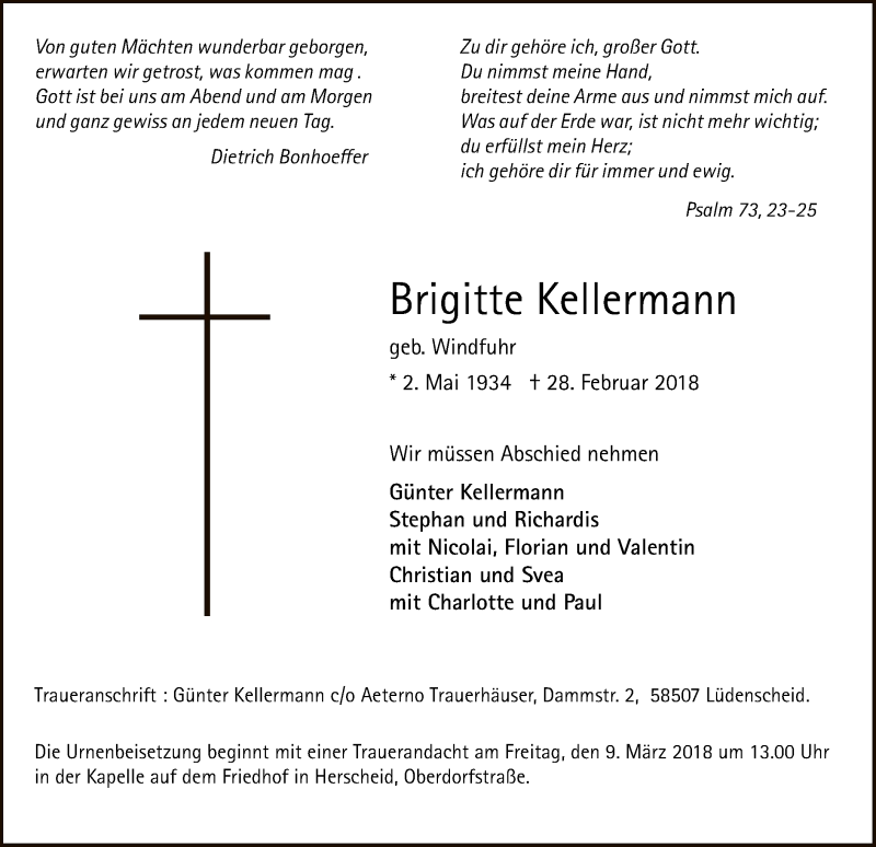 Hier finden Sie alle Traueranzeigen aus der Zeitung, die bisher für Brigitte Kellermann erschienen sind. Weitere Traueranzeigen, die in der Zeitung erscheinen, werden hier ebenfalls aufgelistet