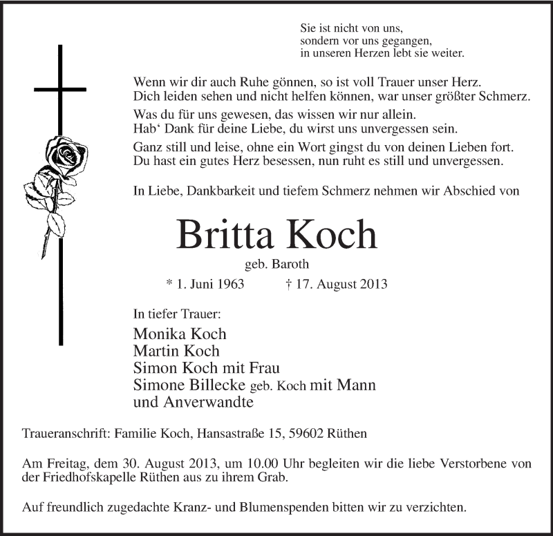 Hier finden Sie alle Traueranzeigen aus der Zeitung, die bisher für Britta Koch erschienen sind. Weitere Traueranzeigen, die in der Zeitung erscheinen, werden hier ebenfalls aufgelistet