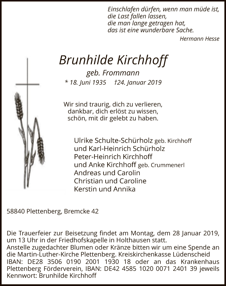 Hier finden Sie alle Traueranzeigen aus der Zeitung, die bisher für Brunhilde Kirchhoff erschienen sind. Weitere Traueranzeigen, die in der Zeitung erscheinen, werden hier ebenfalls aufgelistet