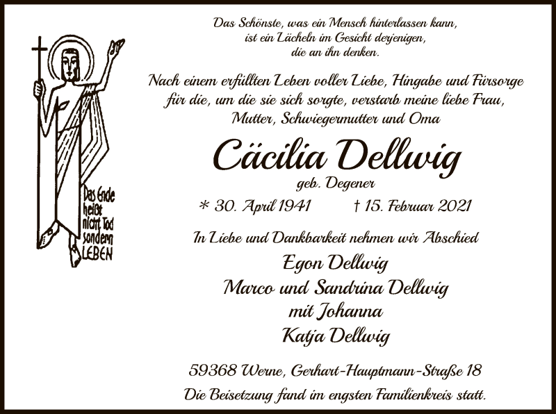 Hier finden Sie alle Traueranzeigen aus der Zeitung, die bisher für Cäcilia Dellwig erschienen sind. Weitere Traueranzeigen, die in der Zeitung erscheinen, werden hier ebenfalls aufgelistet
