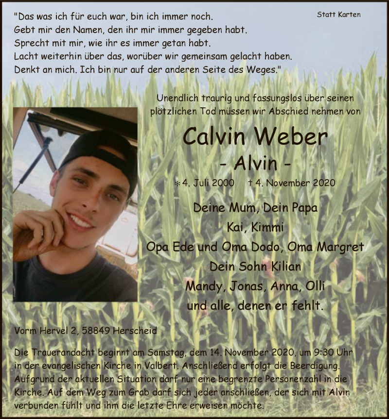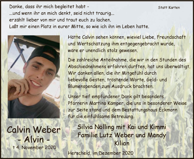 Hier finden Sie alle Traueranzeigen aus der Zeitung, die bisher für Calvin Weber erschienen sind. Weitere Traueranzeigen, die in der Zeitung erscheinen, werden hier ebenfalls aufgelistet