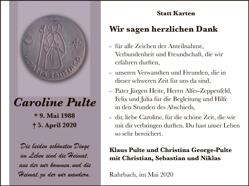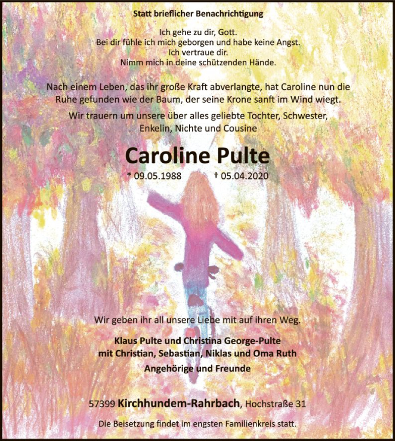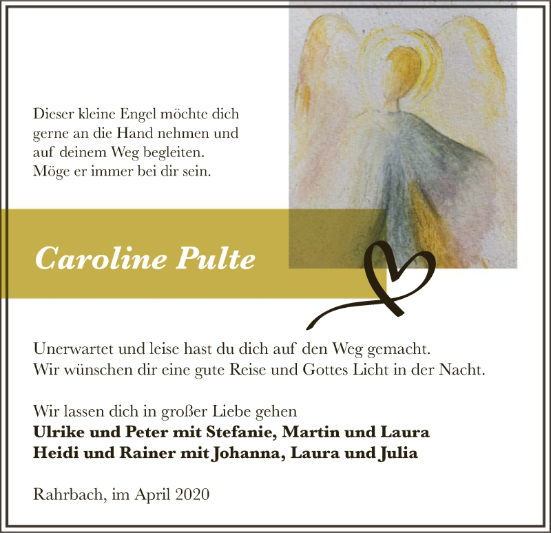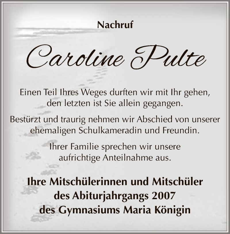 Hier finden Sie alle Traueranzeigen aus der Zeitung, die bisher für Caroline Pulte erschienen sind. Weitere Traueranzeigen, die in der Zeitung erscheinen, werden hier ebenfalls aufgelistet