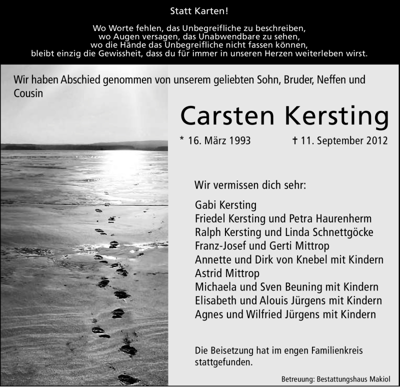 Hier finden Sie alle Traueranzeigen aus der Zeitung, die bisher für Carsten Kersting erschienen sind. Weitere Traueranzeigen, die in der Zeitung erscheinen, werden hier ebenfalls aufgelistet