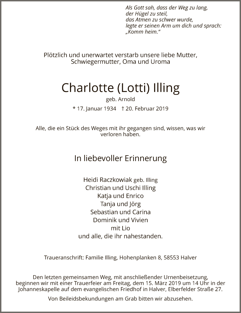 Hier finden Sie alle Traueranzeigen aus der Zeitung, die bisher für Charlotte Illing erschienen sind. Weitere Traueranzeigen, die in der Zeitung erscheinen, werden hier ebenfalls aufgelistet